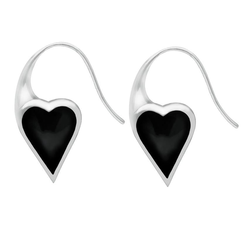This stylish and bold heart shaped two piece set is hand crafted using the finest highly polished Whitby Jet. The heart is carried inside a solid sterling silver frame on the necklace, and in the earrings the Whitby Jet hearts drop down from the solid silver hooks which allow the design to be viewed from the side in a unique way. Comprising of a pair of hook earrings, and necklace, complete with an 18 inch sterling silver chain. All items can be sold separately.
