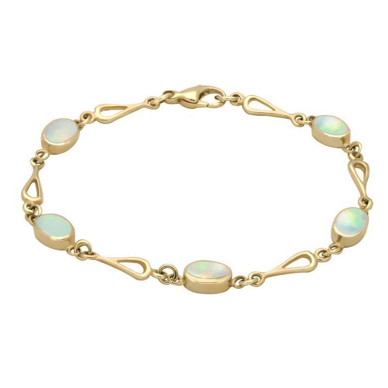 This elegant bracelet features five oval Opal gemstones which are hand carved and set in highly polished 9ct yellow gold. The piece is completed with a classic lobster clasp for easy wear.