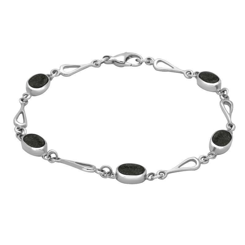 This elegant link bracelet features five oval set pieces of smooth polished Preseli Bluestone, linked between fine silver spoon shaped links. The fastening on this bracelet is a lobster clasp. There are matching items within the collection.