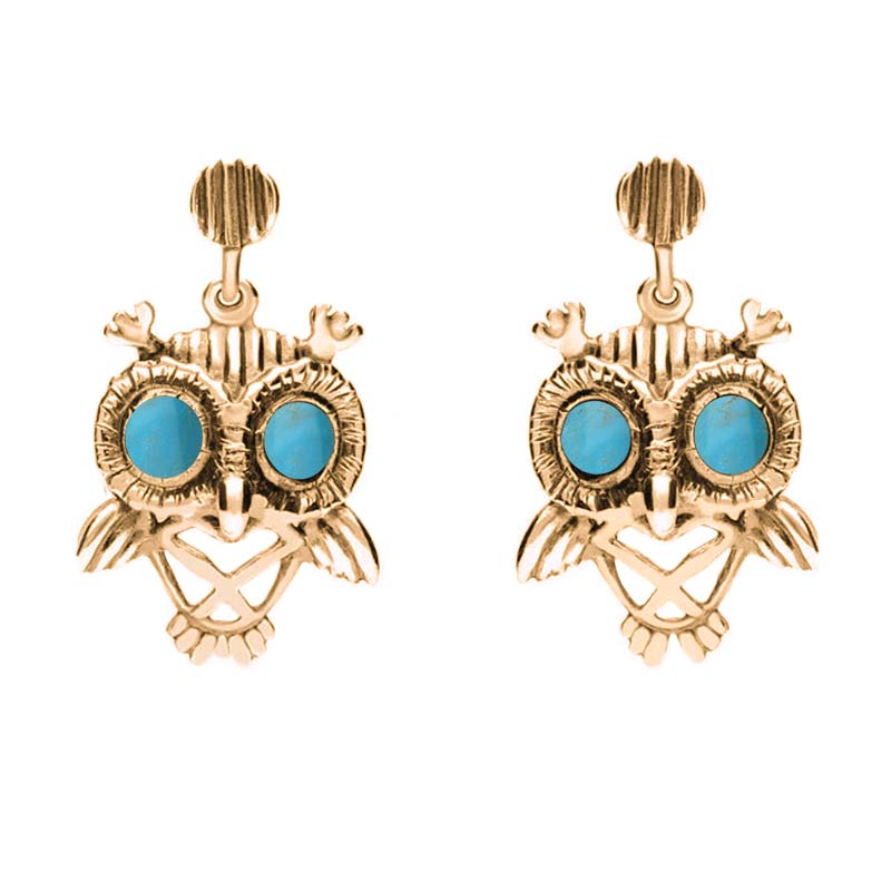 Brighten up your day with these gorgeous 18ct rose gold owl earrings. They feature highly polished Turquoise eyes. The beautiful stones have been sourced directly from the famous Kingman Turquoise mine in Arizona and hand carved by our skilled team in our workshop. Completed with secure 18ct rose gold post and butterfly fittings.