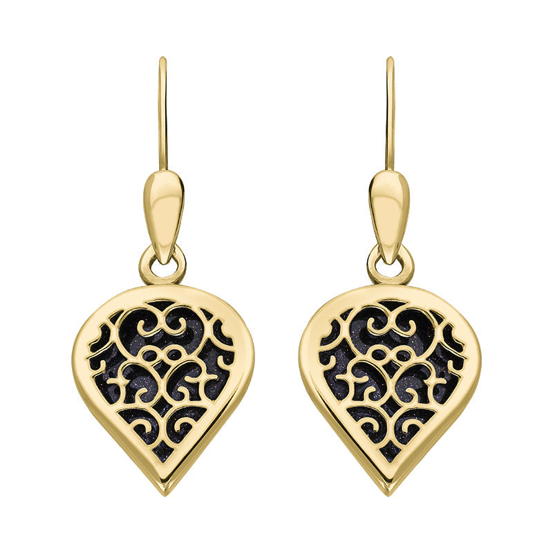 9ct Yellow Gold Blue Goldstone Flore Filigree Heart Drop Earrings. E2588.
