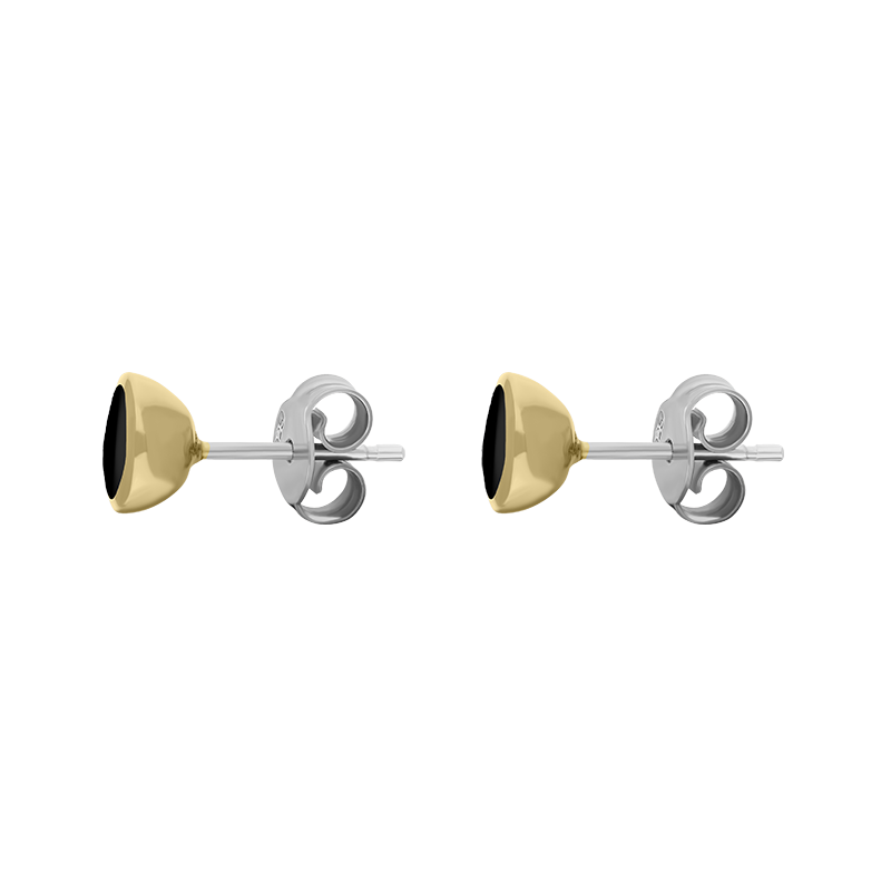 These stud earrings feature highly polished genuine Whitby Jet set in 9ct yellow gold frames with sterling silver post and butterfly fastenings.