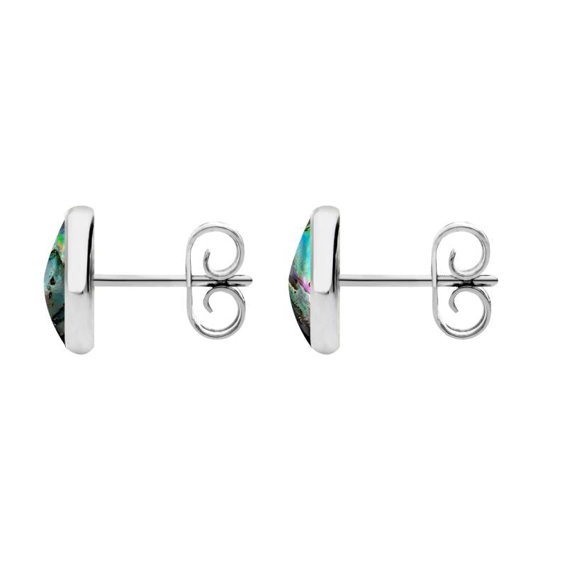 An embodiment of classic style, these sterling silver earrings feature two hand-carved circular cabochons of the finest Abalone shell. The Abalone is elegantly framed in sterling silver and the earrings are completed with secure post and butterfly fastenings, making them perfect for everyday wear.