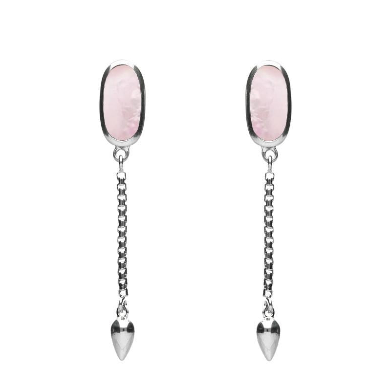 These elegant long drop stud earrings feature long, hand cut oval Pink Mother of Pearl gemstones framed in contemporary sterling silver settings. Fluid 20mm long chains flow from beneath the stones and they are finished with teardrop shaped sterling silver beads. The earrings are completed with classic post and butterfly studs.