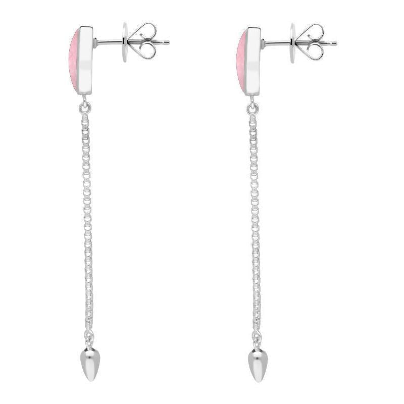 These elegant long drop stud earrings feature, long hand cut oval Rose Quartz gemstones framed in contemporary sterling silver settings. Fluid 35mm long chains flow from beneath the stones and they are finished with teardrop shaped sterling silver beads. The earrings are completed with classic post and butterfly studs.