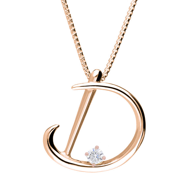 From the 'Love Letters' collection designed and handcrafted by Robert & Victoria, this 9ct rose gold necklace features an initial 'D' with a stunning G-H SI 3mm diamond in a claw setting. The pendant and stone hang elegantly from an 18 inch 9ct rose gold chain.