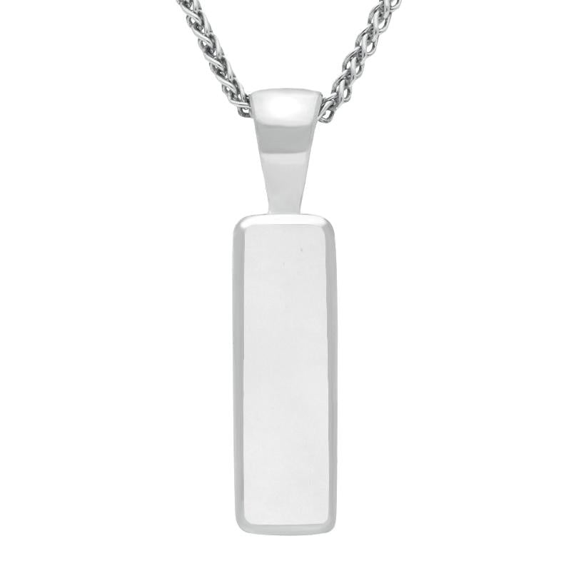 This contemporary pendant showcases a beautifully polished and hand carved oblong shaped Bauxite gemstone set in sterling silver. Very slightly rounded at the corners, the pendant has a softer appearance, and would suit a majority of styles and occasions. Presented on an 18 inch silver chain through a fixed bail.