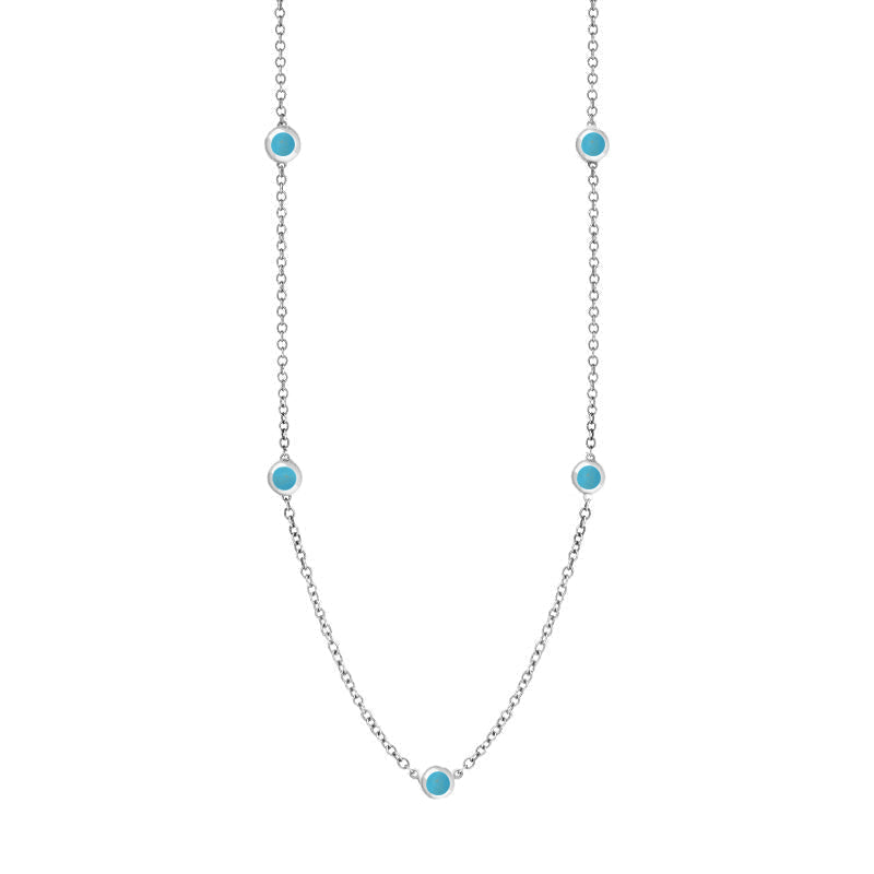 This on trend sterling silver chain necklace features petite discs embellished with star shaped fine Turquoise stones that have been sourced directly from the North East coast of Yorkshire.