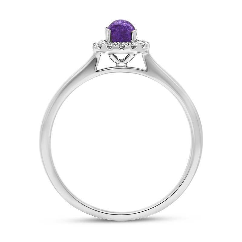This classic and elegant 18ct White gold ring features an round cabochon of the finest Blue John, sourced locally from the North East coast of Yorkshire. The Blue John stone is held in place with an 18ct white claw setting and surrounded by a sparkling halo of brilliant cut diamonds, totalling 0.10ct. Designed perfectly for everyday wear, this gemstone set piece would make the perfect engagement ring featuring a rare British gemstone.