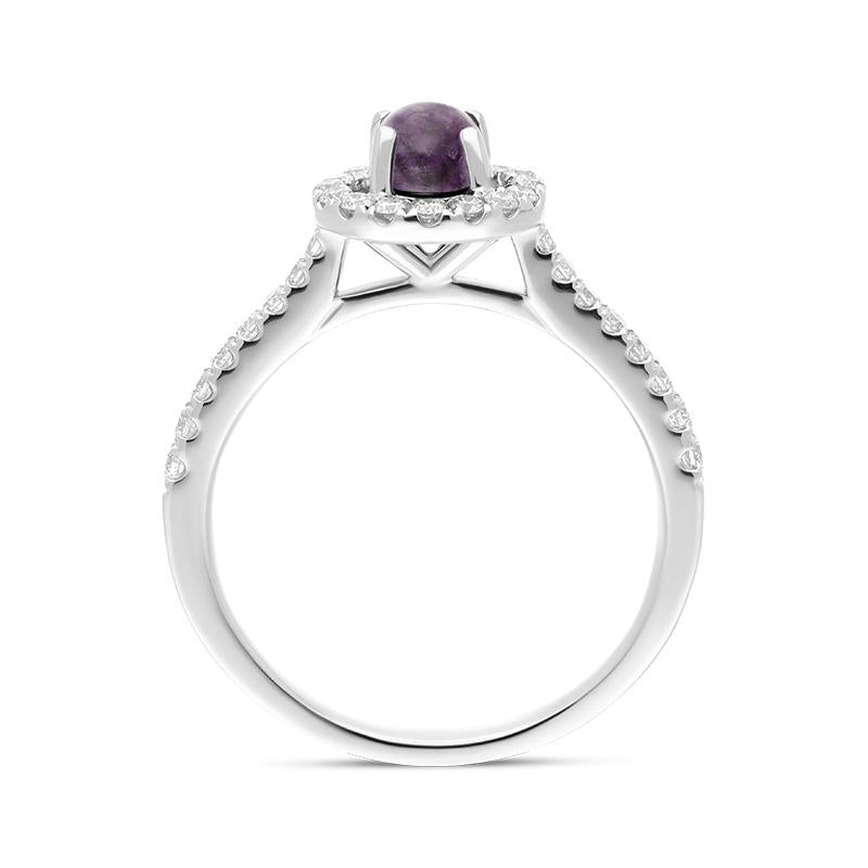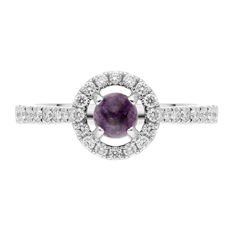 This feminine ring features a round cabochon of rare Blue John stone, directly sourced from Castleton, Derbyshire. The stone is set in 18ct white gold and surrounded by a sparkling halo of 0.33ct brilliant cut diamonds, which also extend down the shoulders of the classic band.