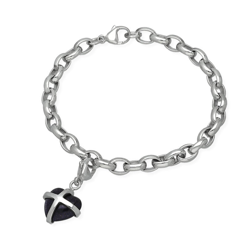 A signature design by Robert & Victoria, this elegant bracelet is part of our Cross Hearts collection. The bracelet features a hand carved heart shaped Blue Goldstone. The individual highly polished gemstone has been framed within a 9ct White gold mount that embraces the stone in a cross design. A secure lobster clasp and solid 9ct White gold chain completes the bracelet.