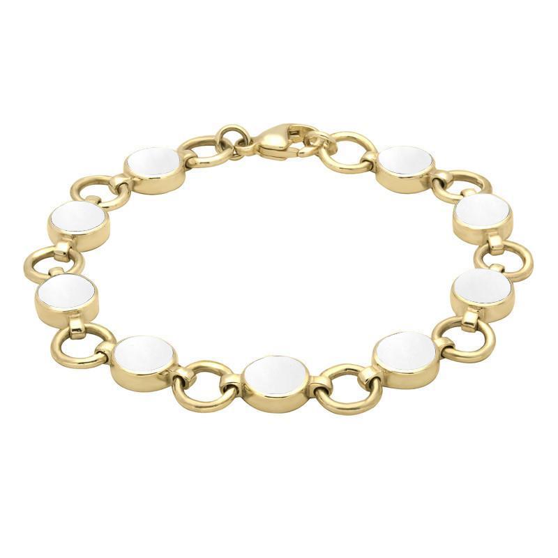This stunning bracelet features nine cabochons of the finest sourced Bauxite. The highly polished gemstones are set between handcrafted solid 9ct yellow gold ring links. Completed with a secure 9ct yellow gold lobster clasp. A beautiful, eye-catching addition to any jewellery lover's collection.