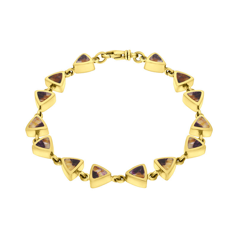 This statement bracelet features 14 curved triangle shaped highly polished Blue John gemstones which are set in 9ct Yellow Gold. The bracelet is secured by a solid lobster clasp fastening.
