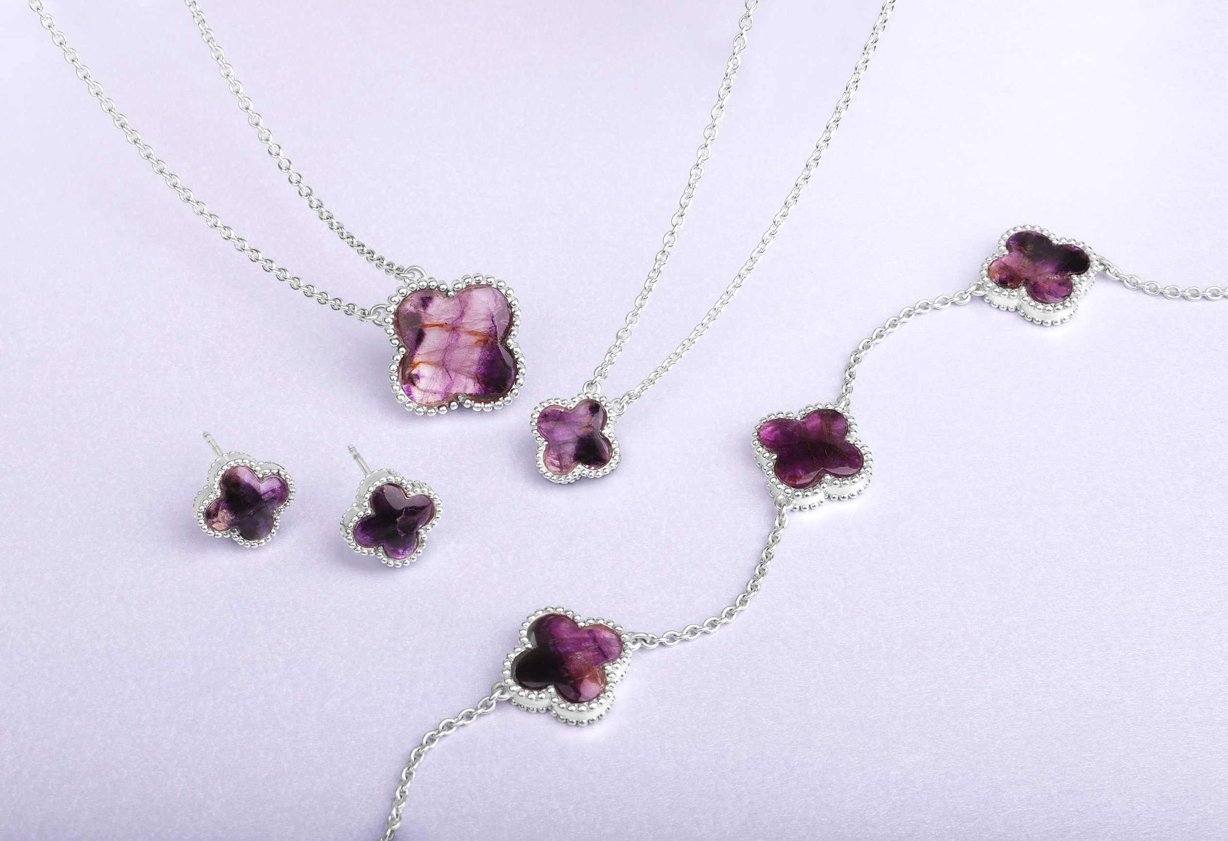 Click here to be notified by when Sterling Silver Blue John Bloom Three Stone Four Leaf Clover Ball Edge Chain Bracelet becomes available.