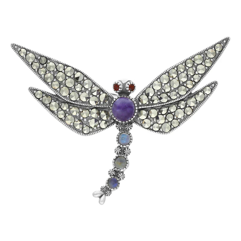 Sterling Silver Blue John Marcasite Garnet Moonstone Dragonfly Brooch