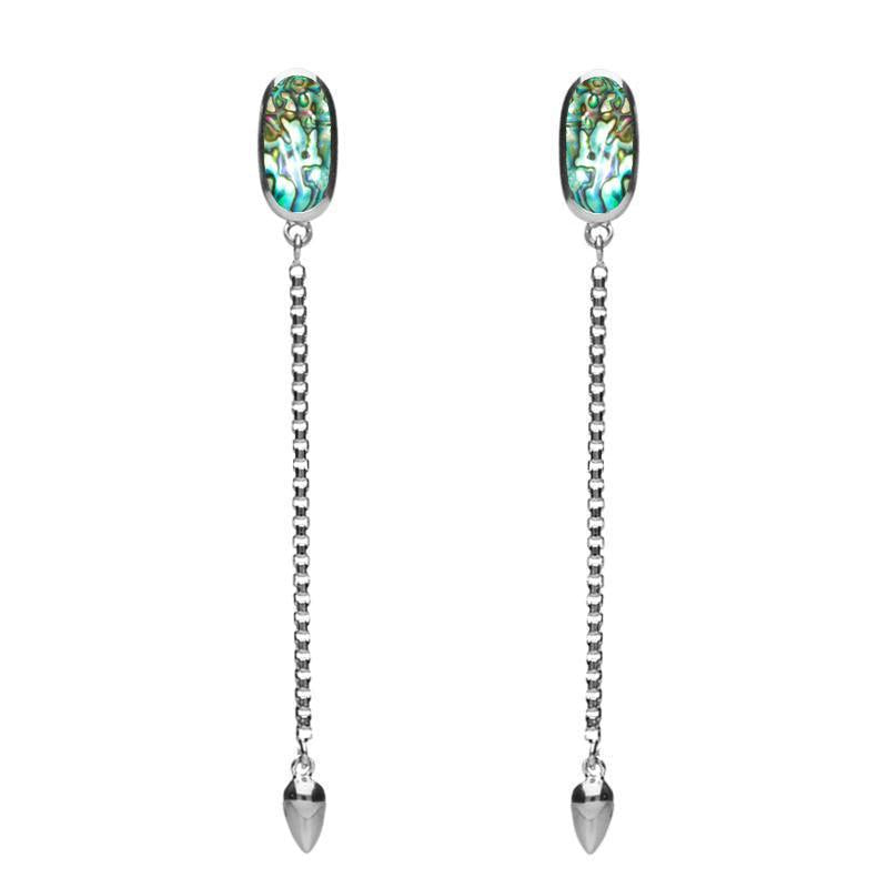 With minimalist design and a distinct architectural edge, these elegant long drop stud earrings feature 10mm long, hand cut Abalone shell framed in contemporary sterling silver settings. Fluid 35mm long chains flow from beneath the shells and they are finished with teardrop shaped sterling silver beads. The earrings are completed with classic post and butterfly studs.