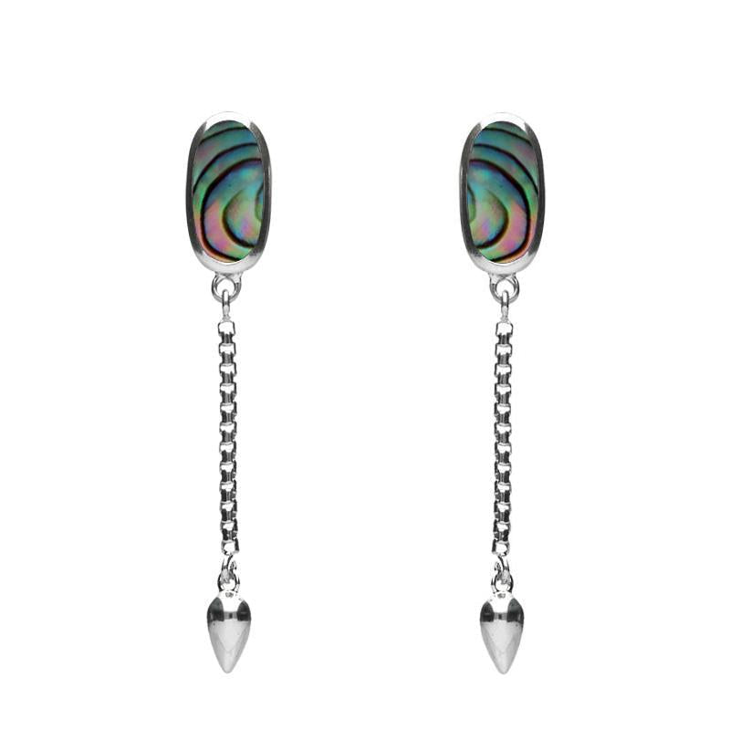 These elegant long drop stud earrings feature long, hand cut oval Abalone shells framed in contemporary sterling silver settings. Fluid 20mm long chains flow from beneath the shells and they are finished with teardrop shaped sterling silver beads. The earrings are completed with classic post and butterfly studs.