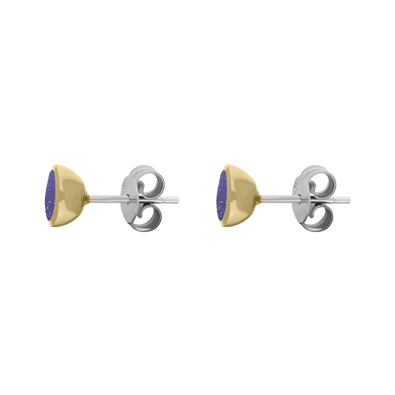 These stud earrings feature highly polished genuine Blue Goldstone set in 9ct yellow gold frames with sterling silver post and butterfly fastenings.
