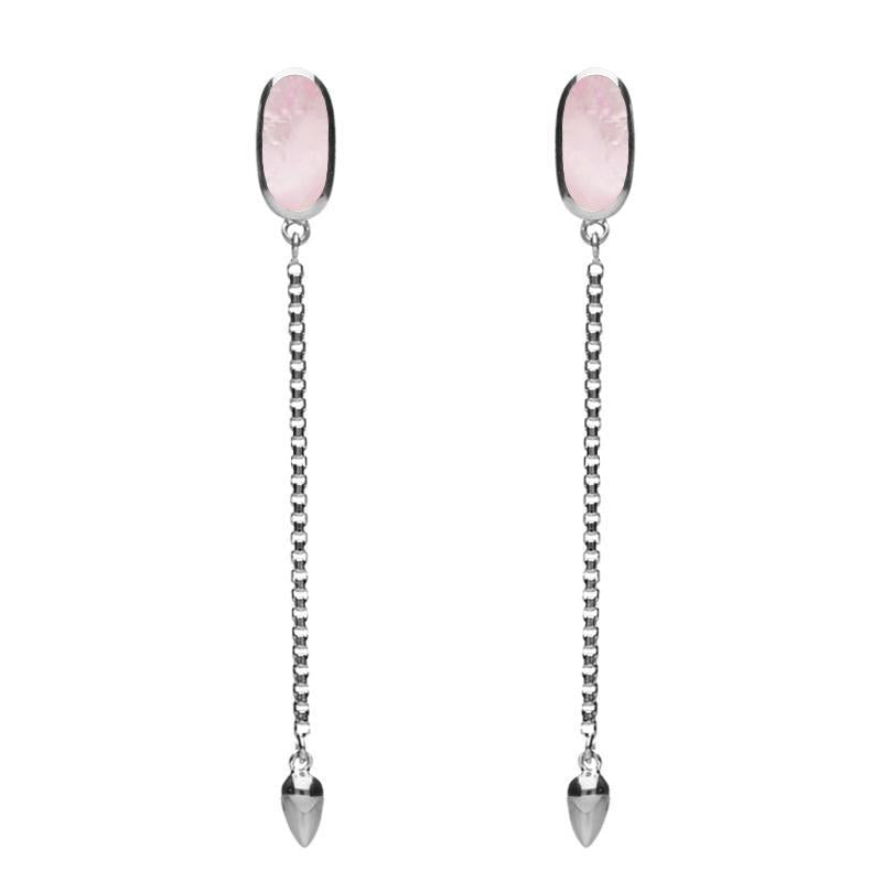 With minimalist design and a distinct architectural edge, these elegant long drop stud earrings feature 10mm long, hand cut Pink Mother Of Pearl shell framed in contemporary sterling silver settings. Fluid 35mm long chains flow from beneath the stones and they are finished with teardrop shaped sterling silver beads. The earrings are completed with classic post and butterfly studs.