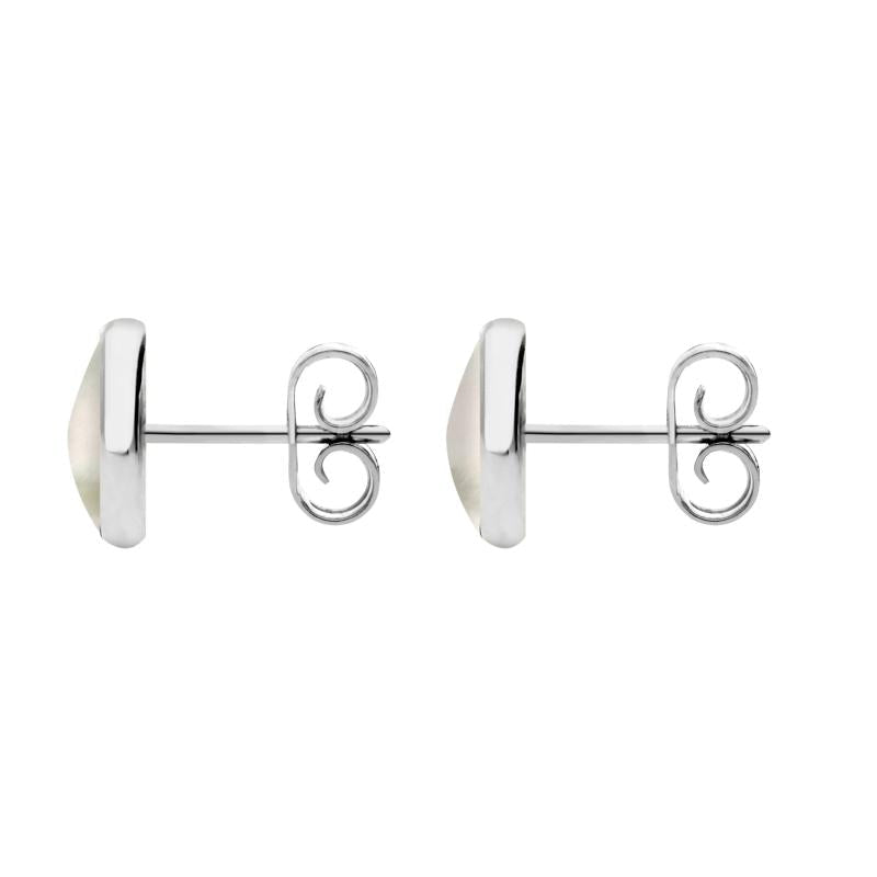 An embodiment of classic style, these sterling silver earrings feature two hand-carved circular cabochons of the finest White Mother of Pearl stone. The White Mother of Pearl is elegantly framed in sterling silver and the earrings are completed with secure post and butterfly fastenings, making them perfect for everyday wear.