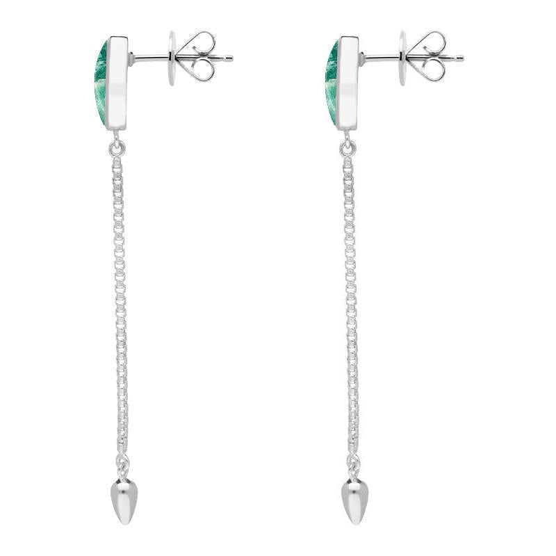 With minimalist design and a distinct architectural edge, these elegant long drop stud earrings feature 10mm long, hand cut Amazonite gemstones framed in contemporary sterling silver settings. Fluid 35mm long chains flow from beneath the stones and they are finished with teardrop shaped sterling silver beads. The earrings are completed with classic post and butterfly studs.