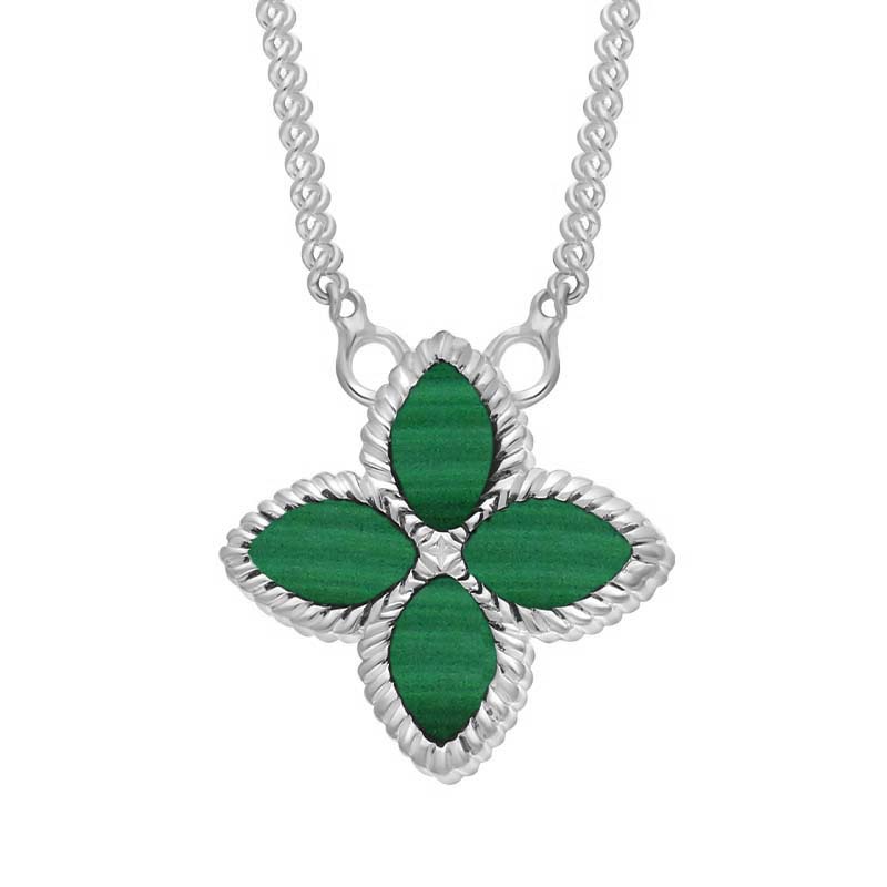This elegant necklace features four stunning marquise shaped cabochons of the finest Malachite stone in the shape of a flower, sourced directly from the north east coast of Yorkshire. The flower is surrounded with a rope edge detail for a unique, stylish finish. The striking Malachite forms a stunning contrast between the 18ct White gold rope edge frame as it hangs from an 18 inch 18ct white gold chain, the perfect look for every occasion..