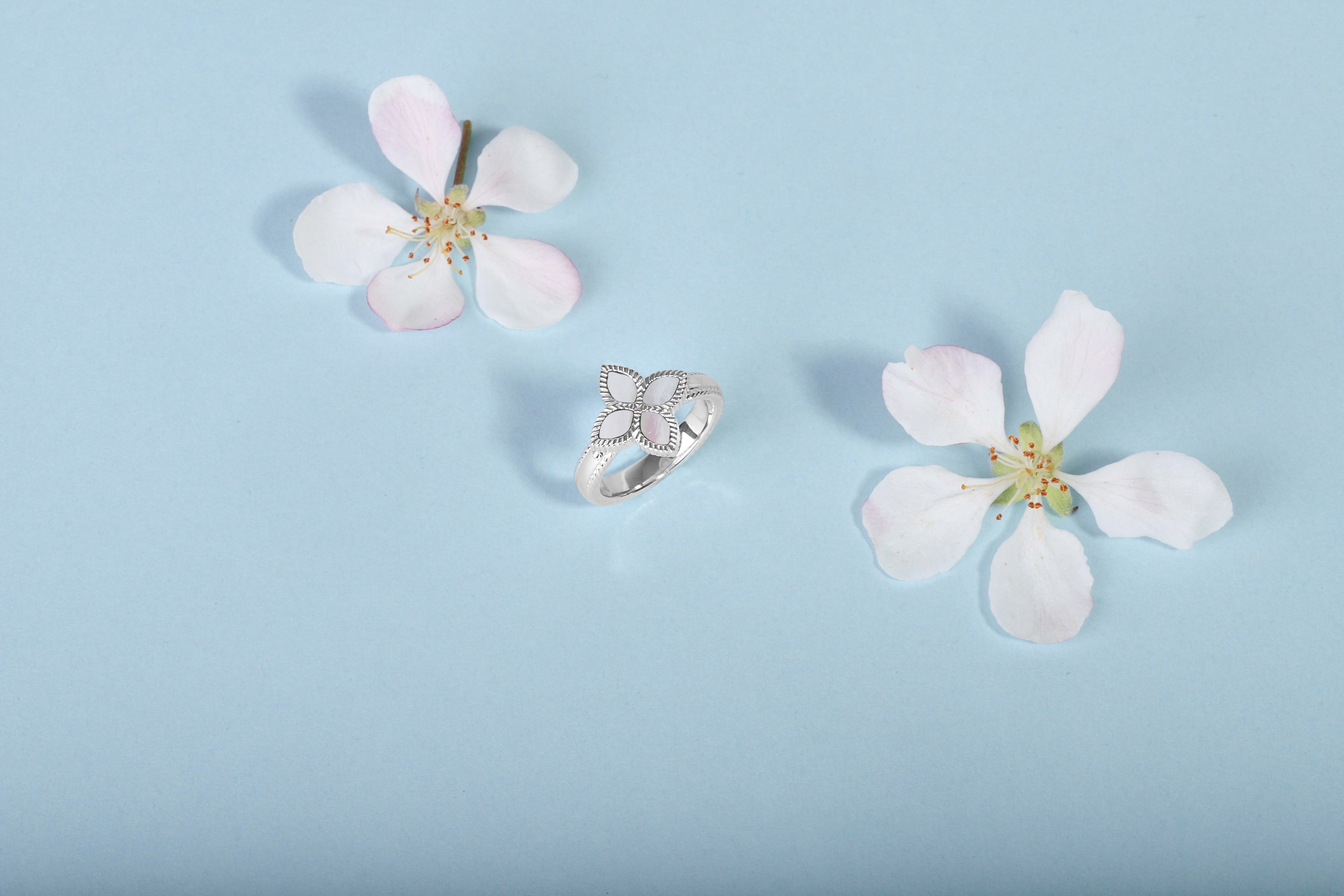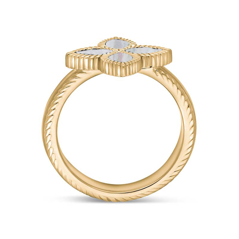 This elegant ring features four stunning marquise shaped cabochons of the finest Mother of Pearl in the shape of a flower. The flower is surrounded with a rope edge detail for a unique, stylish finish. The striking Mother of Pearl forms a stunning contrast between the 18ct yellow gold rope edge frame, creating the perfect look for every occasion.