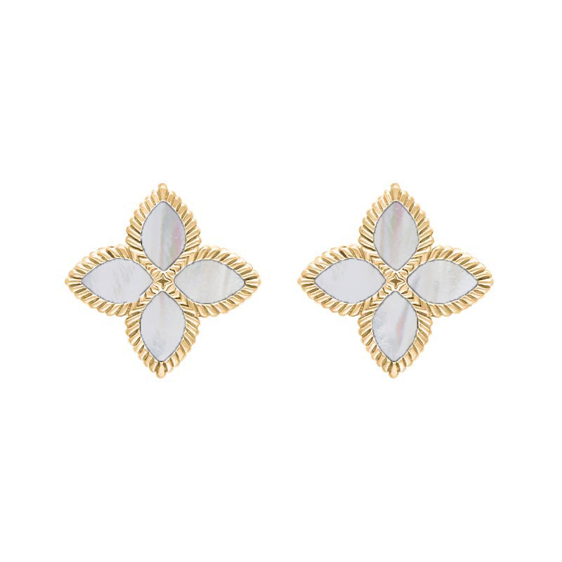 These elegant stud earrings features four stunning marquise shaped cabochons of the finest Mother of Pearl stone in the shape of a flower. The flowers are surrounded with a rope edge detail for a unique, stylish finish. The striking Mother of Pearl forms a stunning combination with the 18ct yellow gold, the perfect look for every occasion. Presented on post and butterfly fitments for secure wear.