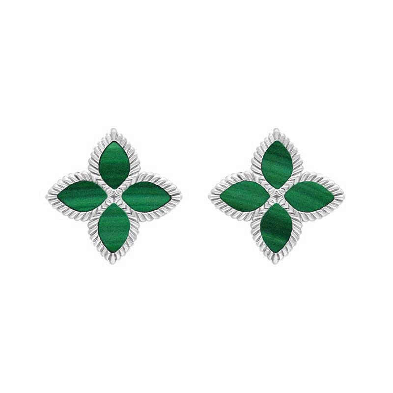These elegant stud earrings features four stunning marquise shaped cabochons of the finest Malachite stone in the shape of a flower, sourced directly from the north east coast of Yorkshire. The flowers are surrounded with a rope edge detail for a unique, stylish finish. The striking Malachite forms a stunning contrast between the 9ct White gold rope edge frame, creating the perfect look for every occasion. Presented on post and butterfly fitments for secure wear.