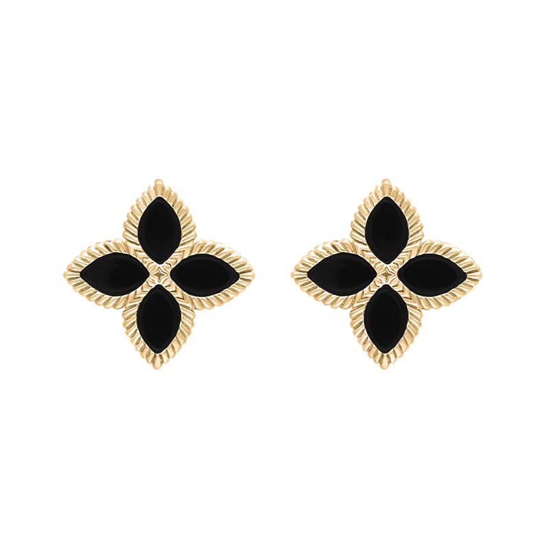 These elegant stud earrings features four stunning marquise shaped cabochons of the finest Whitby Jet stone in the shape of a flower, sourced directly from the north east coast of Yorkshire. The flowers are surrounded with a rope edge detail for a unique, stylish finish. The striking Whitby Jet forms a stunning contrast between the 9ct Yellow gold rope edge frame, creating the perfect look for every occasion. Presented on post and butterfly fitments for secure wear.