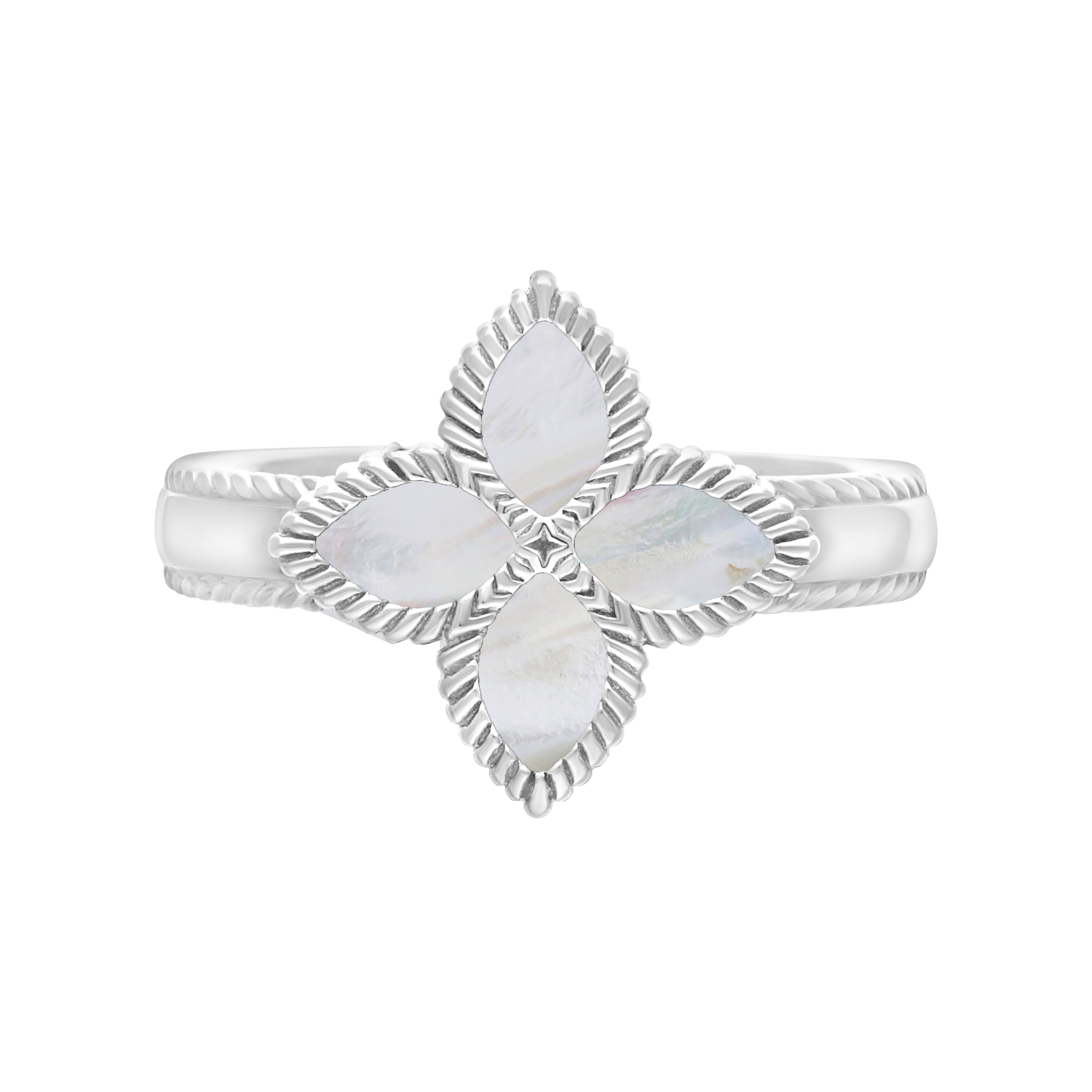 This elegant ring features four stunning marquise shaped cabochons of the finest Mother of Pearl in the shape of a flower. The flower is surrounded with a rope edge detail for a unique, stylish finish. The striking Mother of Pearl forms a stunning union between the sterling silver rope edge frame, creating the perfect look for every occasion.