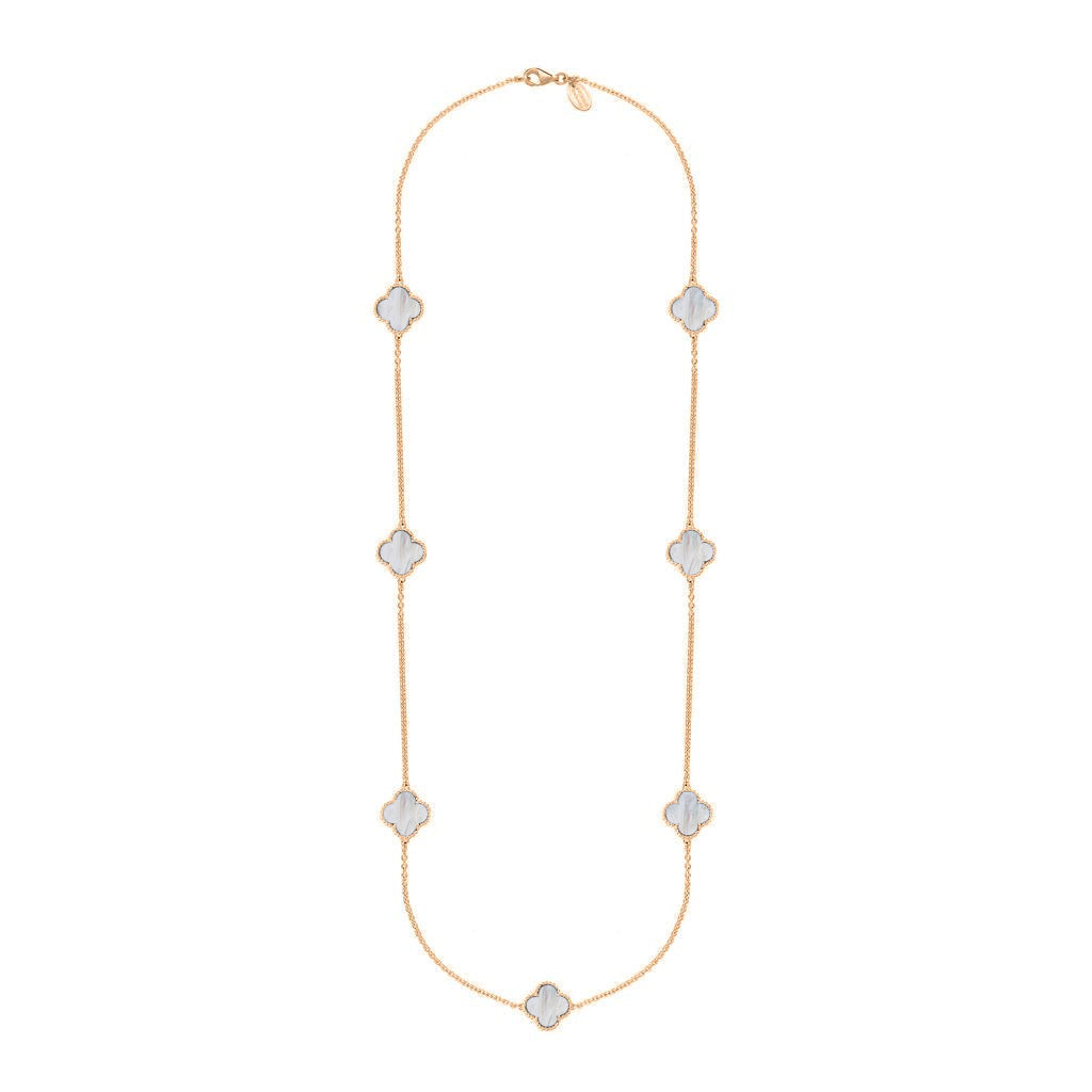 • 18ct Rose Gold White Mother of Pearl Bloom Four Leaf Clover Ball Edge Long Necklace - N1040 (BLM-411)