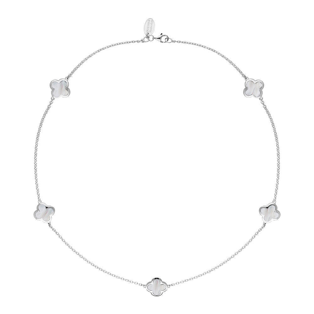 This elegant necklace features five stunning four leaf clover shaped cabochons of the finest Mother of Pearl. The clover is surrounded with a smooth edge detail for a sleek finish. The striking Mother of Pearl forms a stunning combination with the 18ct white gold as the clover hangs gracefully along a 77cm chain, the perfect look for every occasion.