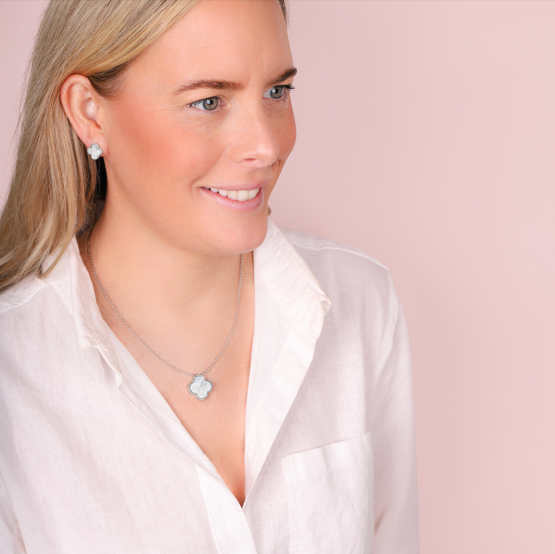 This elegant necklace features a stunning four leaf clover shaped cabochon of the finest Mother of Pearl. The clover is surrounded by a ball edge detail for a unique, stylish finish. The striking Mother of Pearl forms a stunning combination with the 18ct white gold ball frame, creating the perfect look for every occasion. Presented on an 18 inch long chain.