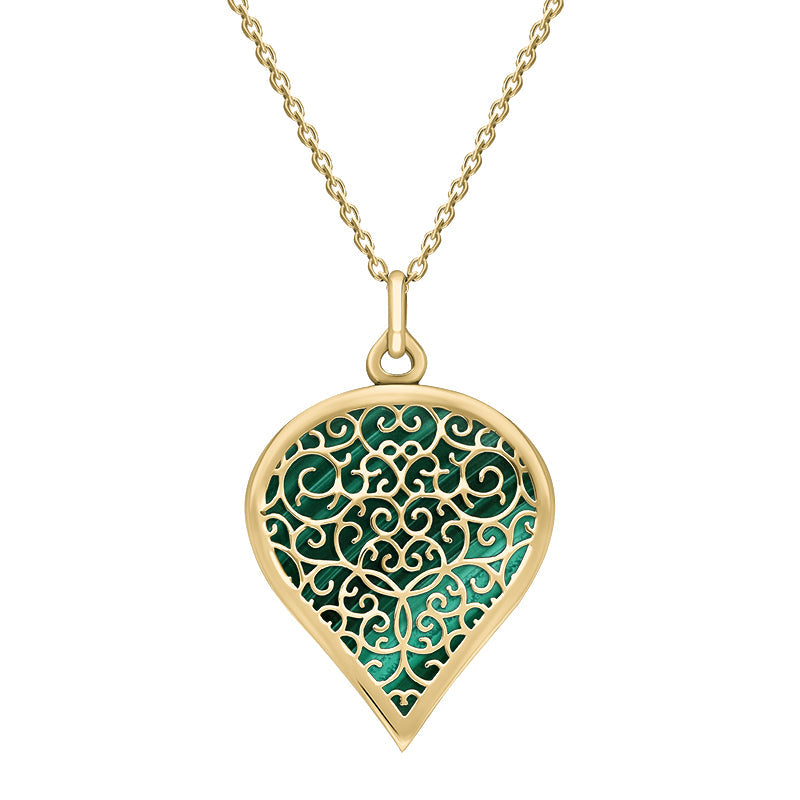 18ct Yellow Gold Malachite Flore Filigree Large Heart Necklace. P3631.