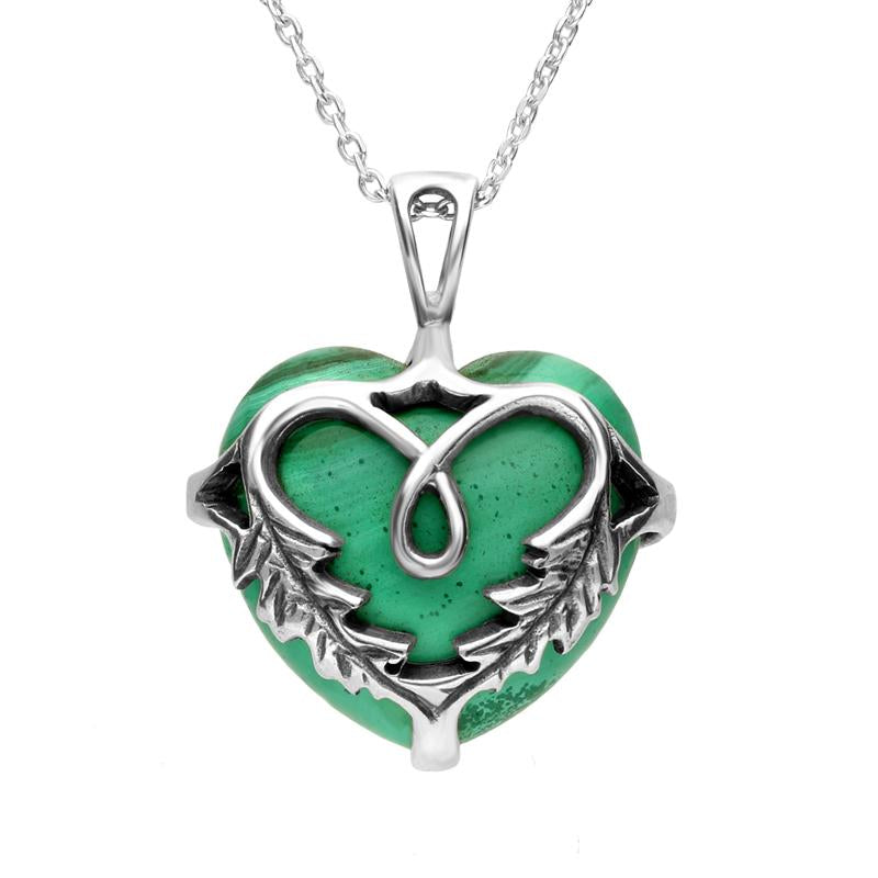 A stylish and unique design, featuring a beautifully hand carved heart of Malachite. With unique markings and patterns, this truly is a one of kind piece of jewellery. Sterling silver work in the form of the Acanthus plant overlays the heart gemstone. The pendant is presented on an 18 inch sterling silver chain which loops through an elegant bale at the top of the heart. Dimensions: 21mm x 22mm.