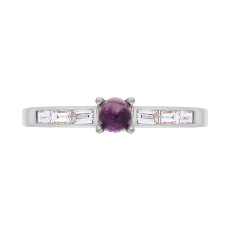 This unique 18ct white gold ring features a stunning hand carved cabochon of the finest round Blue John stone measuring approximately 4mm in diameter, which has been sourced locally from Castleton, in the heart of the Peak District. A row of channel set baguette cut diamonds totalling 0.31cts are set either side of the beautiful Blue John stone. The perfect engagement ring featuring a rare British gemstone.