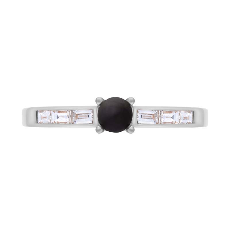 This unique 18ct white gold ring features a stunning hand carved cabochon of the finest round Whitby Jet stone measuring approximately 4mm in diameter, which has been sourced directly from the North East coast of Yorkshire. A row of channel set baguette cut diamonds totalling 0.31cts are set either side of the beautiful Whitby Jet stone. The perfect engagement ring featuring a rare British gemstone.