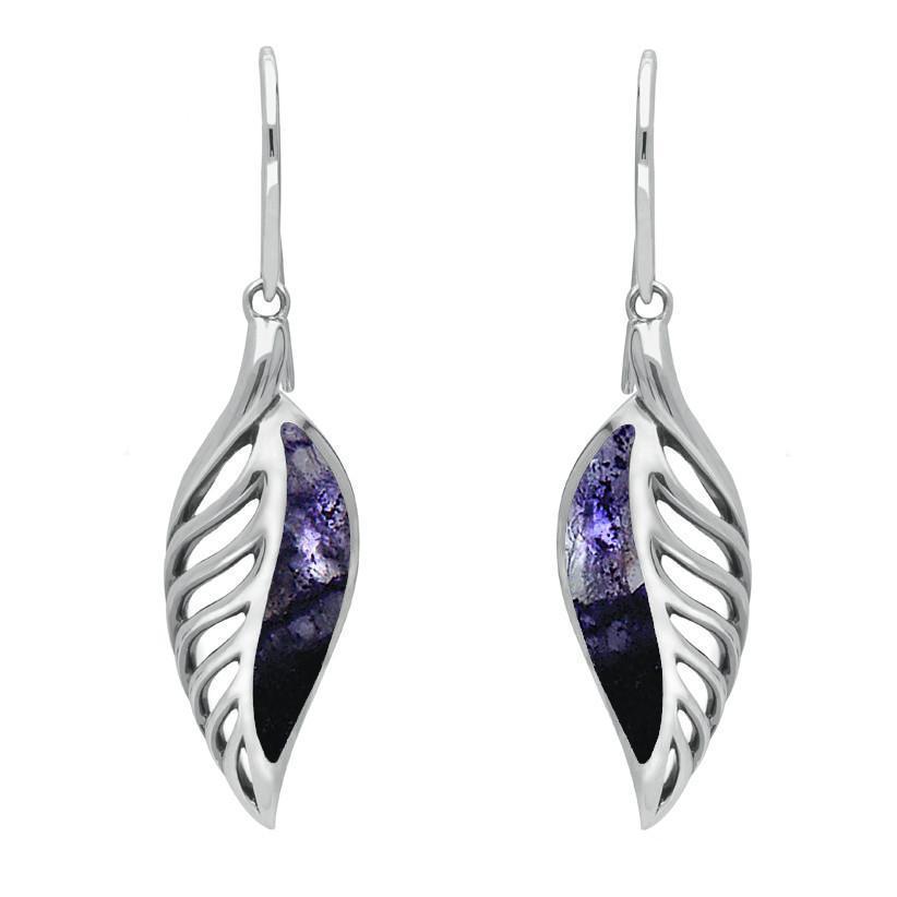 A perfect gift for a loved one, this beautiful sterling silver and Blue John two piece set features a beautiful leaf design. The hand carved Blue John gemstones are framed by sterling silver, and takes the form of a leaf in a modern and stylish, natural design. Comprising of a pair of hook earrings, and necklace, complete with an 18 inch sterling silver chain. All items can be purchased separately.