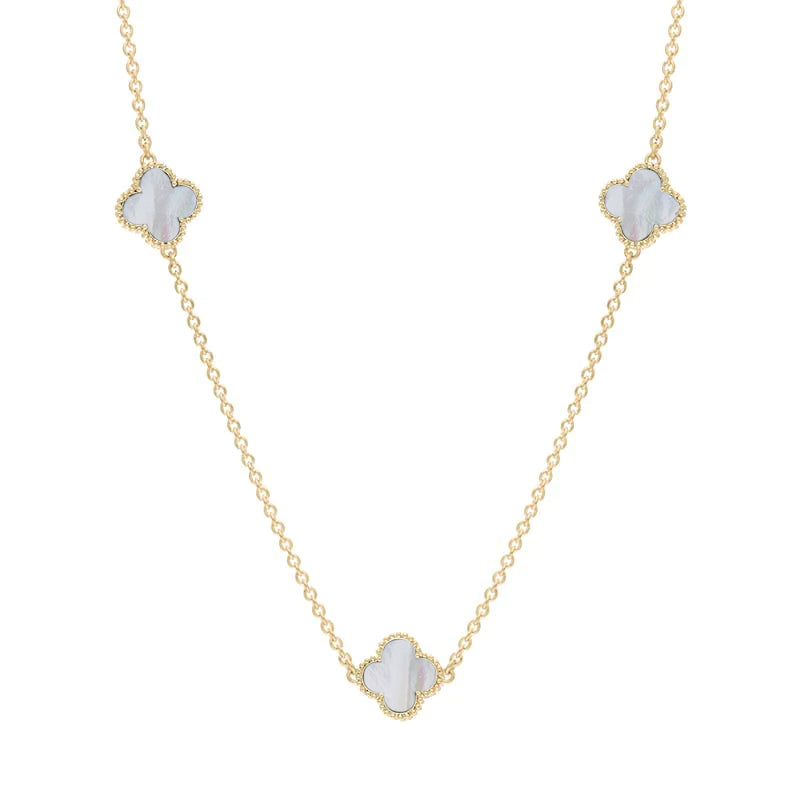 18ct Yellow Gold White Mother of Pearl Bloom Four Leaf Clover Ball Edge Necklace
