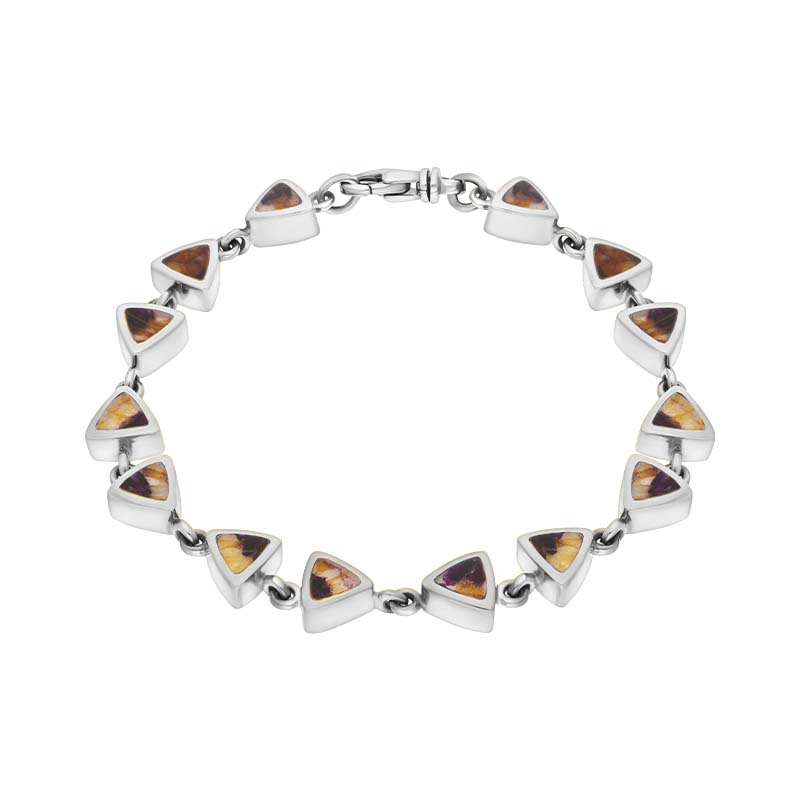 This statement bracelet features 14 curved triangle shaped highly polished Blue John gemstones which are set in 9ct White Gold. The bracelet is secured by a solid lobster clasp fastening.