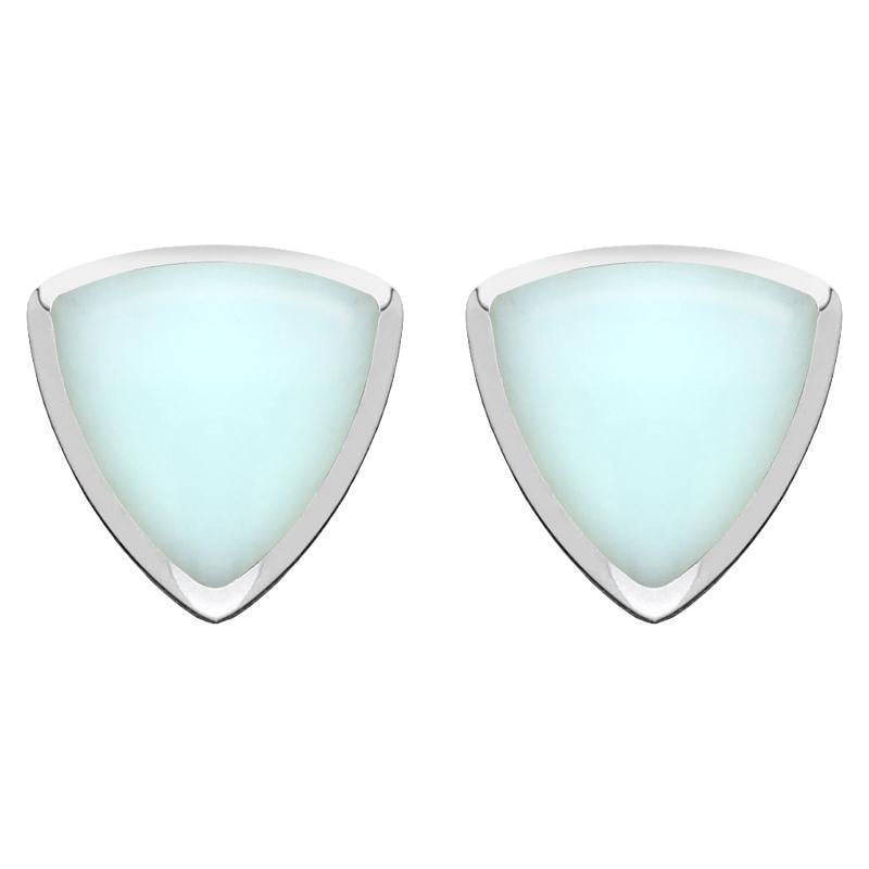 These simple and elegant stud earrings feature the finest, natural Chrysoprase in a curved triangle design. Completed with secure sterling silver post and butterfly fittings.
