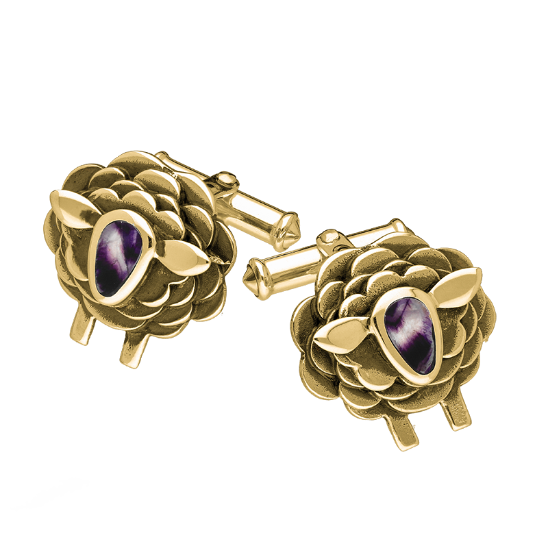 These simple cufflinks feature a beautiful sheep design, where a stunning piece of Blue John completes the sheep face on each 9ct Yellow Gold cufflink.