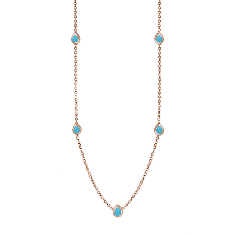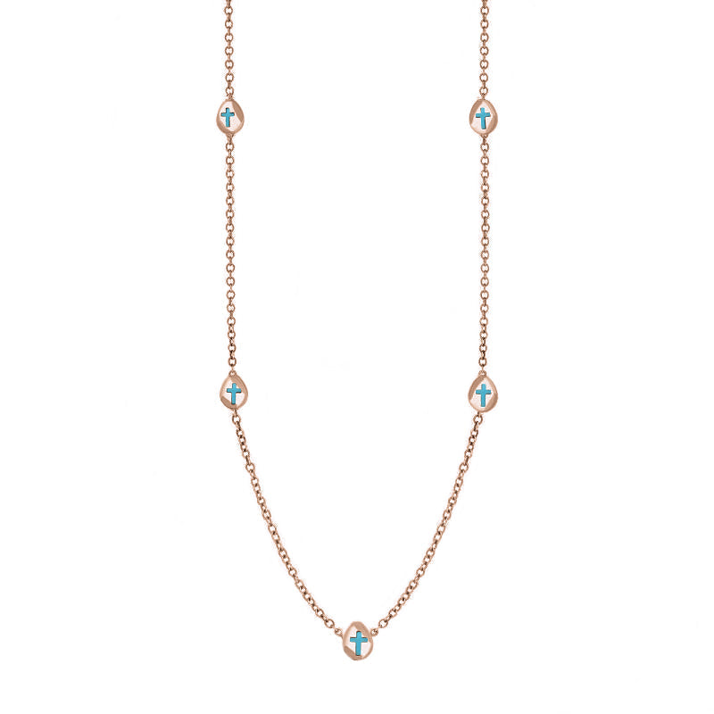 This on trend 9ct rose gold chain necklace features petite discs embellished with cross shaped fine Turquoise stones that have been sourced directly from the North East coast of Yorkshire.
