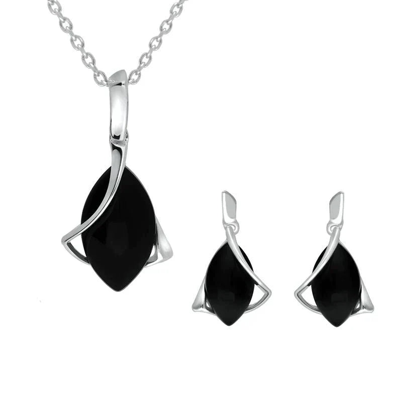 Sterling Silver Whitby Jet Marquise Open Twist Edge Two Piece Set