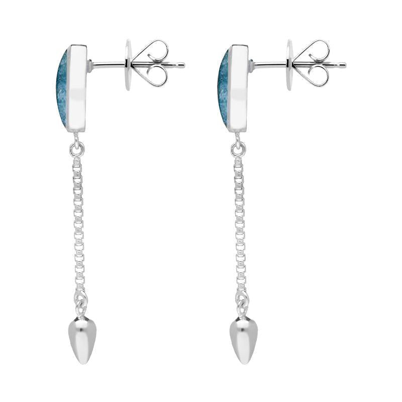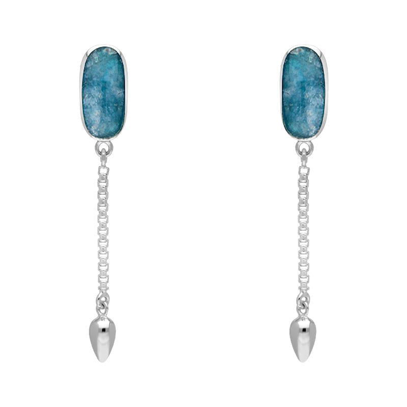 These elegant long drop stud earrings feature long, hand cut oval Aquamarine gemstones framed in contemporary sterling silver settings. Fluid 20mm long chains flow from beneath the stones and they are finished with teardrop shaped sterling silver beads. The earrings are completed with classic post and butterfly studs.