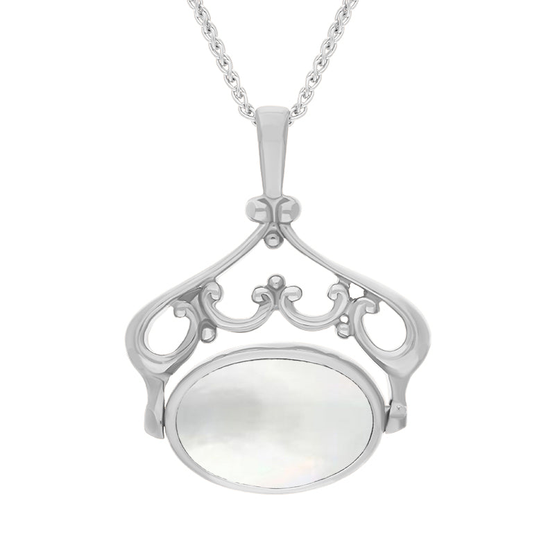 This classic fob swivel necklace is part of the Robert & Victoria Heritage handmade collection and features a double sided pendant set with oval cut locally sourced Blue John and White Mother Of Pearl. The stones are set in an ornate hinged sterling silver pendant, which moves with the wearer and features a unique design, hanging gracefully from an 18 inch sterling silver chain.