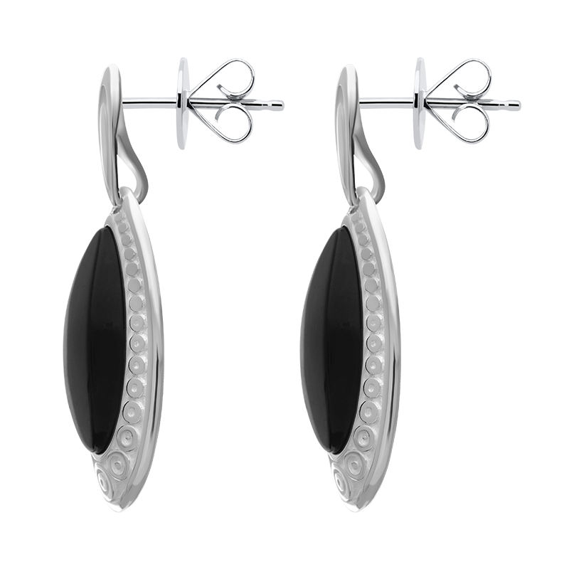 These versatile pear drop shaped earrings feature the finest Whitby Jet, sourced directly from the north east coast of Yorkshire. The stones are framed in Sterling Silver. These feminine earrings are perfect for day through to evening wear and are secured with post and butterfly fitments.