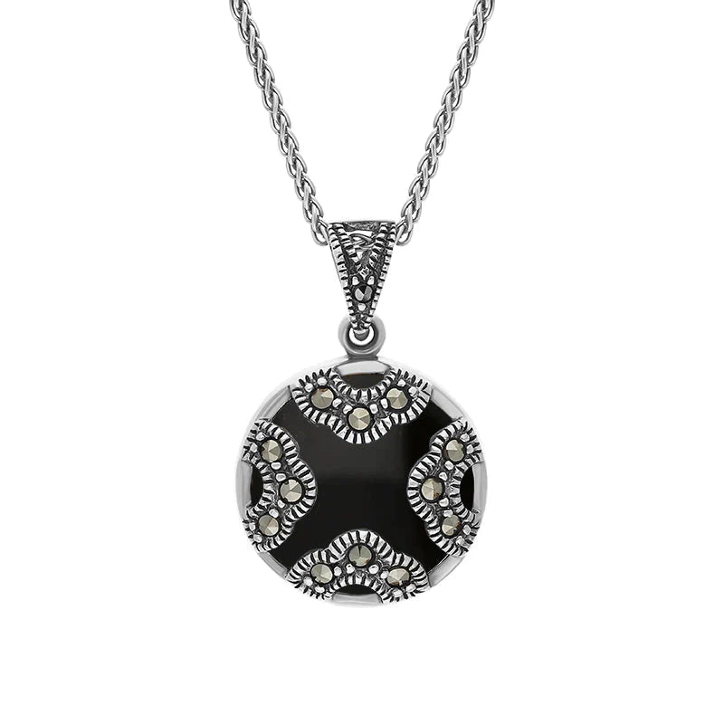 This feminine necklace features a stunning circular shaped Whitby Jet stone, sourced directly from the North East coast of Yorkshire. The stone is set within a sterling silver floral arc design which is adorned with marcasite gemstones, bringing a sophisticated sparkle to the piece. The pendant hangs gracefully from a marcasite embellished bail on a sterling silver 18 inch chain complete with a classic bolt ring clasp for easy wear.