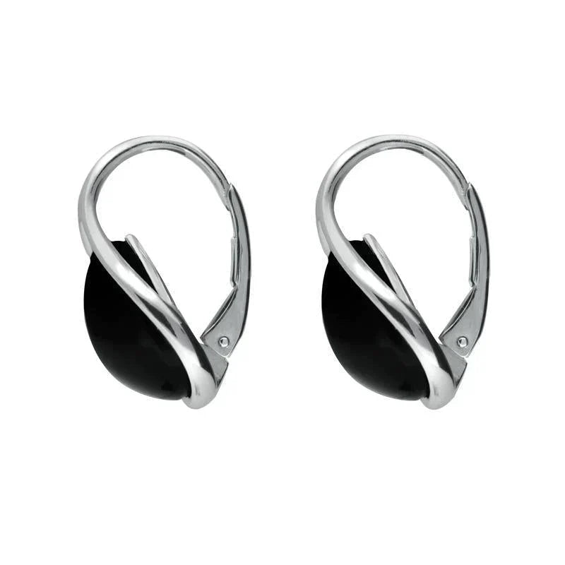 These elegant earrings feature a hand carved pear shaped Whitby Jet gemstone, set within an open sterling silver frame and attached to a silver lever back fastening. Perfect for every day wear.